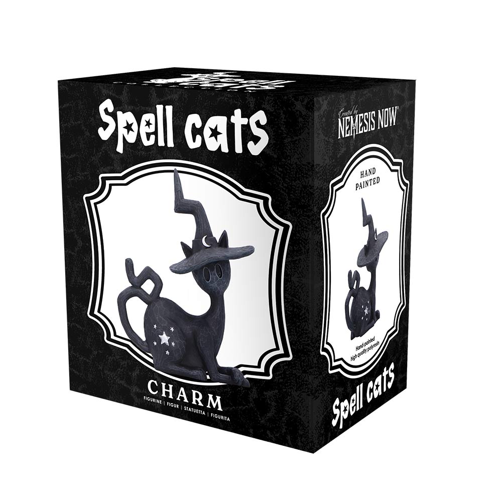Hand-painted black with silver details, a curled tail, and a uniquely designed witch's hat, all crafted in high-quality resin for a premium finish.