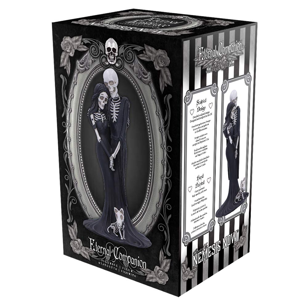 Gothic-inspired figurine symbolising everlasting love featuring two skeleton lovers locked in an embrace, along with a skeleton dog companion.