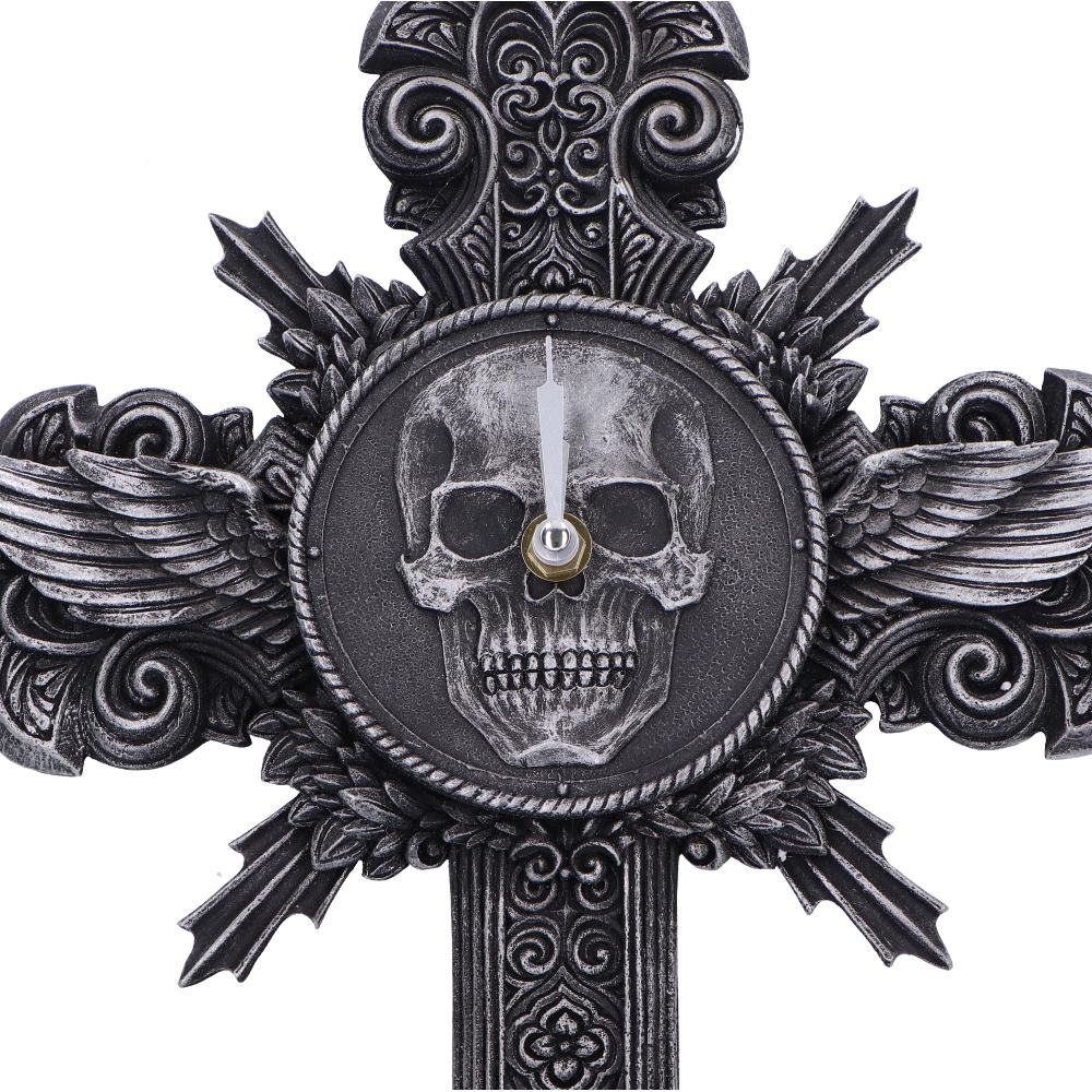 A winged skull clock face set within a gothic frame, enhanced by intricate silver detailing and ornate textures.