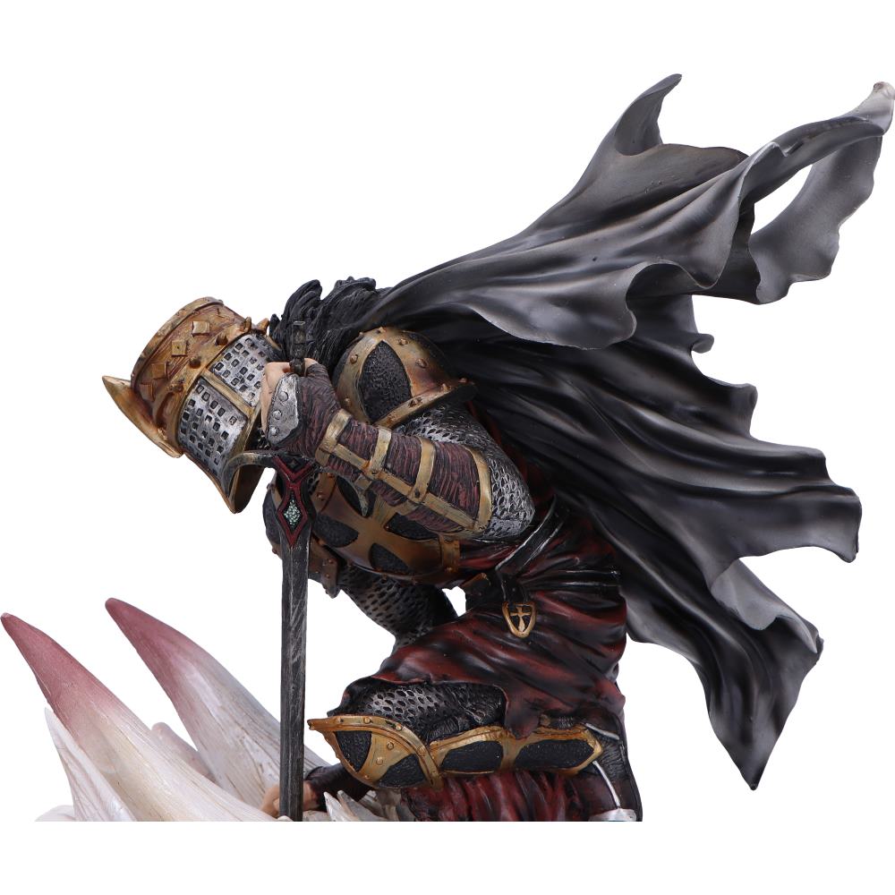 Detailed resin figurine of a kneeling knight atop a slain dragon